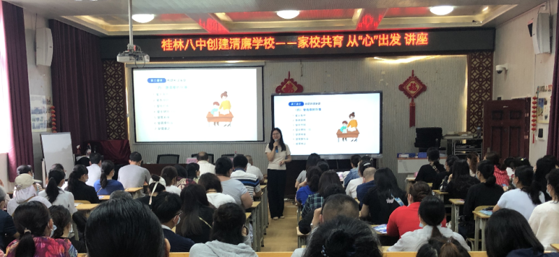 接着,由桂林市第八中学心理室覃圆媚老师,给家长们作了一堂“家校共育,从‘心’出发”的精彩讲座。覃圆媚老师从实际案例引入,讲解了《家庭教育促进法》的相关内容,并从心理学角度,给家长们提供一些可行的家庭教育建议,让家长更好地关注孩子的心理健康,以构筑和谐的家庭教育。