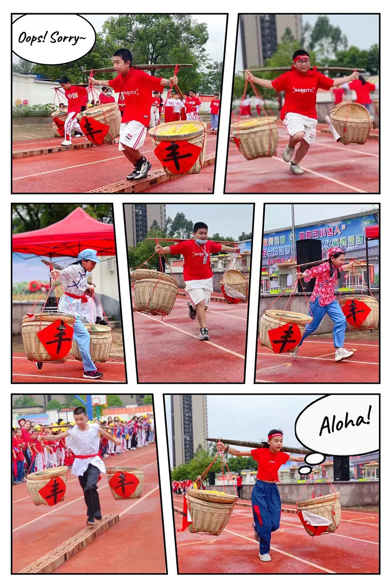 瞧,六年级的孩子们手推独轮小车,屏息凝神,生怕车里的蔬菜棒掉落,伙伴们的呐喊声是最佳的助力;五年级的孩子们从未体验过用扁担挑粮食,看着孩子们肩挑扁担、脚踩“田埂”晃晃悠悠地向队友冲去,在场的小观众们都不禁捏了把汗。老师也树立劳动榜样参与到活动中。