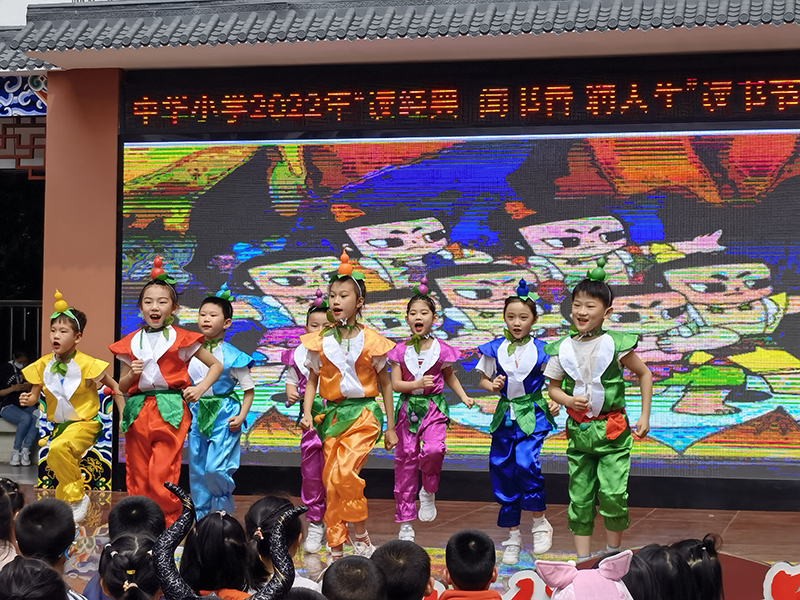 操场上,全校师生举行“书中人物角色扮演”嘉年华活动。整个展演分6个板块进行。民间神话传说节目:“葫芦娃”内容轻松活泼,深受孩子们的喜欢。历史人物的节目:中国共产党的先驱者李大钊、勇敢机智的王二小、长征路上最小的红军王新兰,依次出现,让孩子们更深入的了解了英雄的事迹。古风组:关羽、小乔、嫦娥、花木兰的出现,让孩子们有种穿越时空的感觉,跟随着这些历史人物探寻历史的故事。公主系列:白雪公主、爱莎公主和冰雪公主的出场让所有的女孩子们都圆了一个公主梦。情景剧《哈利波特》这个节目,表演中,孩子们的表情真挚,咬字准确,装扮大方,得到了台下师生们热情的欢呼,把整个活动推向了高潮。最后一个节目是童话系列组:孩子们精彩的演绎了中外经典童话中的角色,如美人鱼、阿拉丁神灯、小红帽、卖火柴的小女孩、黑猫警长等,精彩的节目获得了台下师生的一片掌声。