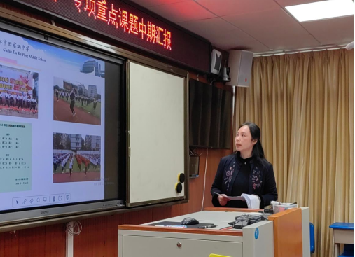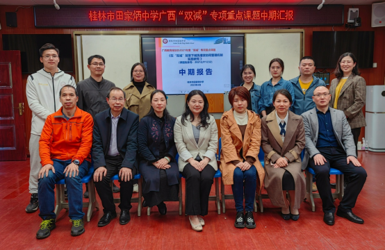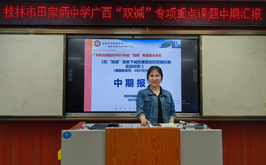 为扎实推进教科研工作的开展,提高课题研究质量,及时发现课题研究中存在的问题,确保课题研究的实效性,桂林市田家炳中学于4月26日举行广西教育规划办2021年度“双减”专项重点课题《在“双减”背景下减负增效协同管理机制实践研究》的中期汇报会。桂林市教科所科研办副主任莫莺燕、桂林市教科所科研办专职教研员、课题管理负责人黄琪、桂林市田家炳中学校长蒋立玲、课题负责人李明副校长以及课题组成员参加了会议。