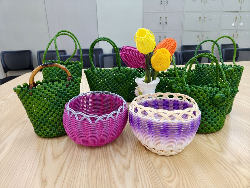 经过一学期的课程的学习,同学们在老师的带领指导下,制作出了藤编花篮、果篮、手提包、鲜花等多幅藤编作品。