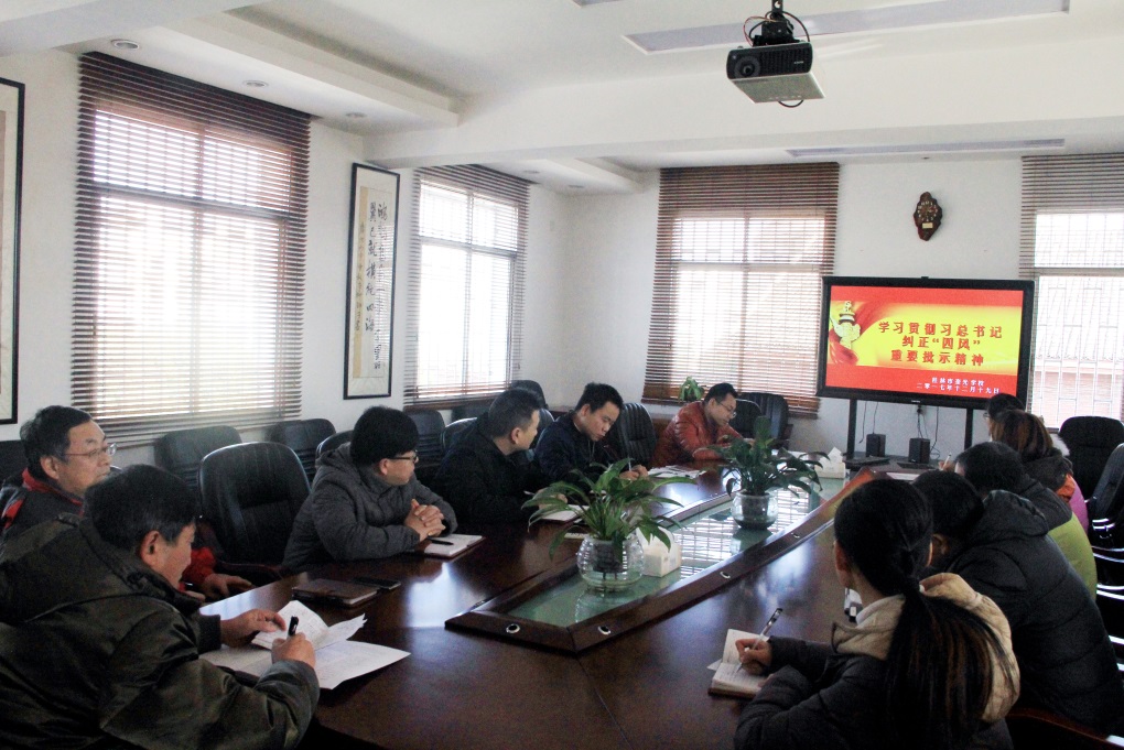 12月19日下午,桂林市奎光学校党支部在学校会议室组织召开会议,传达学习习近平总书记关于进一步纠正“四风”加强作风建设的重要批示精神。会议由学校党支部书记彭耀明主持,学校党员干部及全体行政人员参加会议。