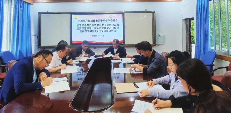 桂林市第十八中学党委书记秦波主持召开学校理论学习中心组深入贯彻中央八项规定精神学习教育4月份交流研讨会议,围绕《习近平总书记关于党的建设的重要思想概论》、中央八项规定及其实施细则精神开展学习研讨交流。