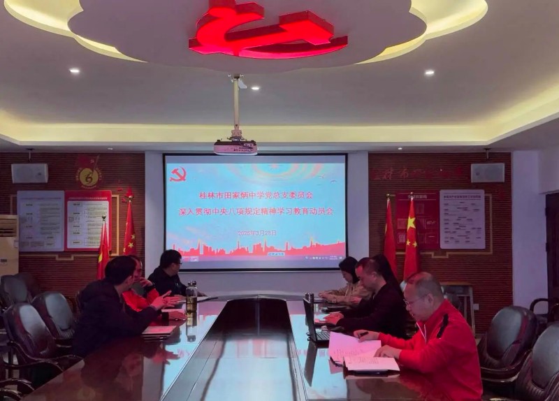 桂林市田家炳中学召开深入贯彻中央八项规定精神学习教育启动会,传达上级文件精神并成立专项工作小组,由学校党总支书记盘开斌担任组长,制定学习计划,确保责任落实到人、任务落实到位,为后续工作奠定坚实基础。