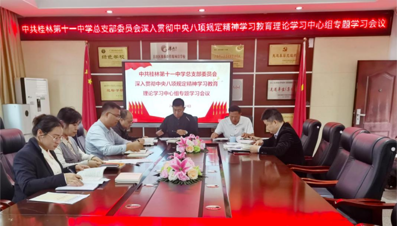 桂林市第十一中学党总支开展深入贯彻中央八项规定精神学习教育集中研讨,进一步深入学习贯彻习近平总书记关于加强党的作风建设的重要论述,认真落实中央八项规定及其实施细则精神。