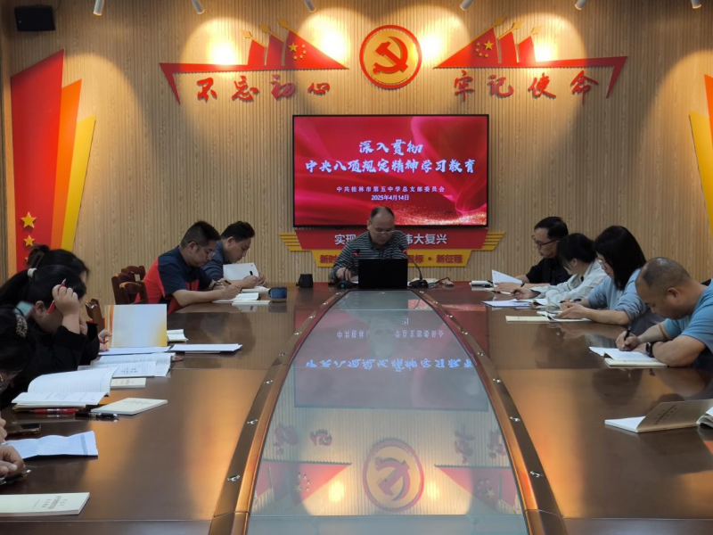 桂林市第五中学党总支以高度的政治责任感和使命感,多措并举推动深入贯彻中央八项规定精神学习教育走深走实。党总支书记刘昌劲带领党员干部深入学习贯彻习近平总书记关于深入贯彻中央八项规定精神学习教育的重要讲话和重要指示精神。党总支委员准确把握学习教育目标任务,把“严的基调、严的措施、严的氛围”长期坚持下去,以身作则推动党员干部做到思想从严、守纪从严、作风从严。