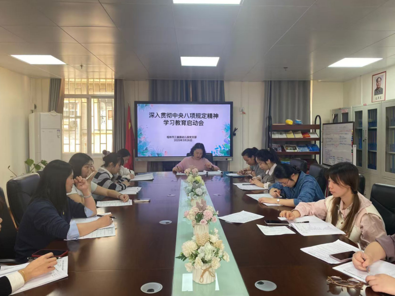 桂林市三皇路幼儿园党支部扎实推进深入贯彻中央八项规定精神学习教育,围绕“严守八项规定,坚守教育初心”主题召开学习教育启动会,依托“三会一课”、读书班、“第一议题”等载体,将深入贯彻中央八项规定精神学习教育融入日常。