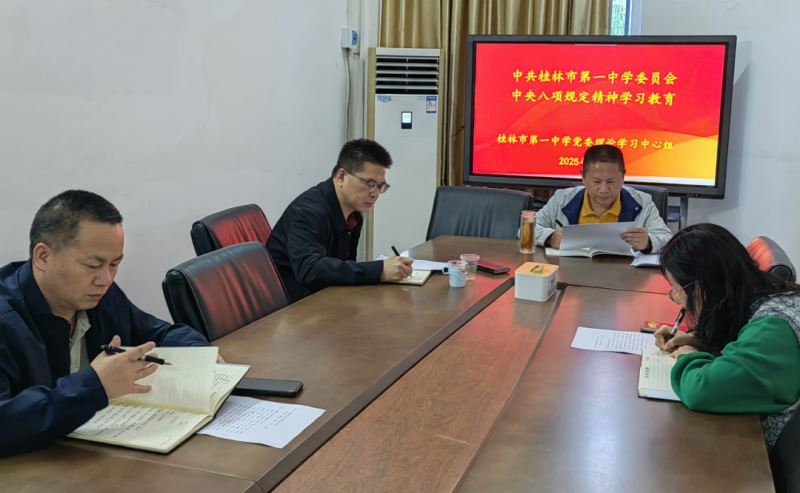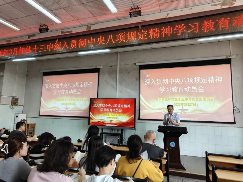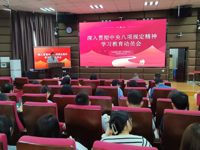 桂林市第一中学党委把深入学习贯彻中央八项规定精神作为重要政治任务,迅速召开专题会议研究部署。学校党委书记李山在党员大会上带领党员教师认真领会习近平总书记关于党的作风建设的重要论述和中央八项规定精神。学校党委要求全体党员干部以钉钉子精神推进落实,筑牢永远在路上的作风建设堤坝,确保学习教育扎实推进。学校党委理论学习中心组集中研讨中央八项规定及其实施细则精神,结合学校实际制定实施方案,深入查找存在的问题,要求各部门要坚持问题导向,认真落实党中央部署,建立健全监督机制,强化财务和食堂管理制度,严防廉政风险。桂林市第一中学党委以强烈的责任感和使命感,迅速动员部署、细化措施、严格督导,把学习成果转化为推动教育高质量发展的实际成效,坚决将中央八项规定精神贯彻落实到教育教学各环节,为办好人民满意的教育提供坚强纪律保障。学校党员干部将以此次学习教育为契机,提高认识,在教育教学和管理中严格遵守中央八项规定,以实际行动干事创业。