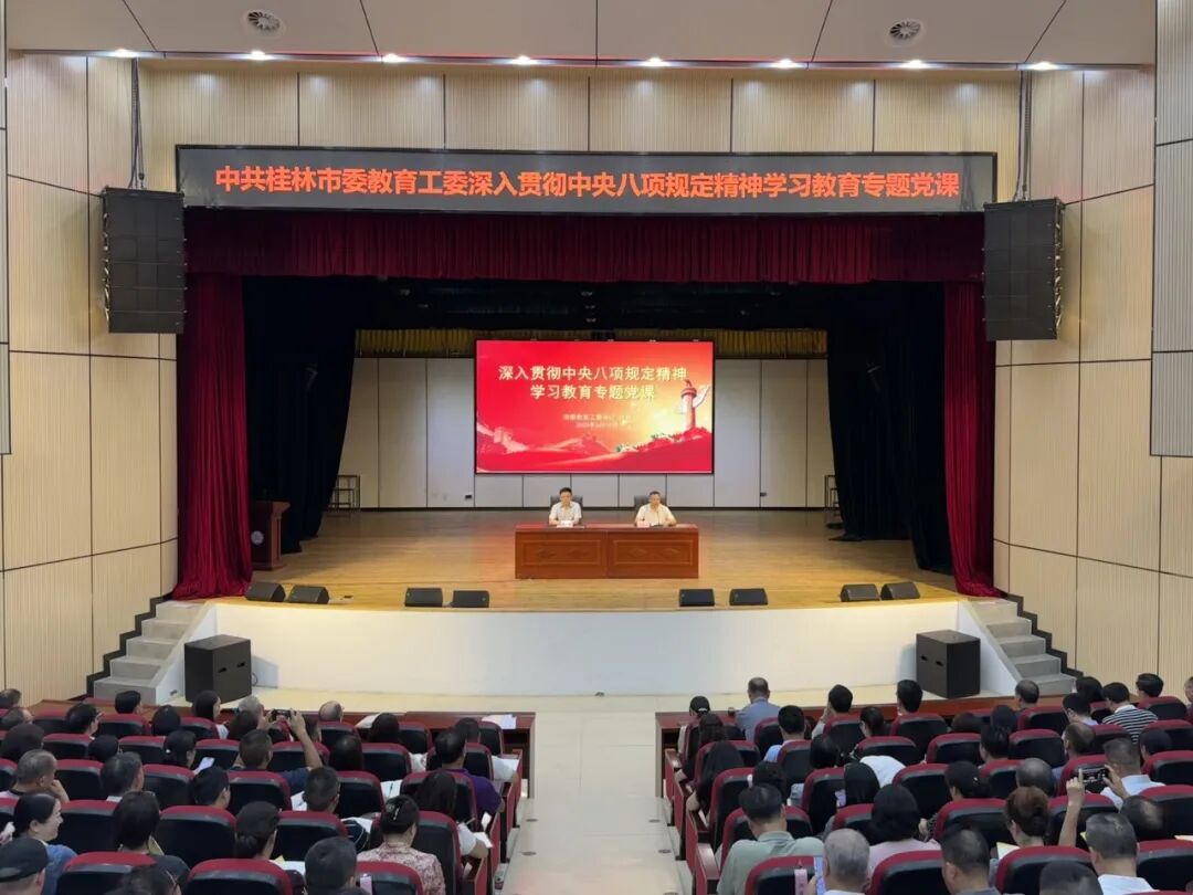 为深入贯彻落实中央八项规定精神,进一步加强党风廉政建设,提高直属教育系统党员干部的纪律意识和规矩意识,筑牢拒腐防变思想防线,6月30日,中共桂林市委员会教育工作委员会组织召开深入贯彻中央八项规定精神学习教育专题党课。市委教育工委书记,市教育局党组书记、局长石岩以“锤炼过硬作风 扛牢育人使命”为题,为直属教育系统党员干部讲授专题党课,并安排部署下一步工作要求。市委教育工委副书记、市教育局党组副书记吴东才主持党课学习。