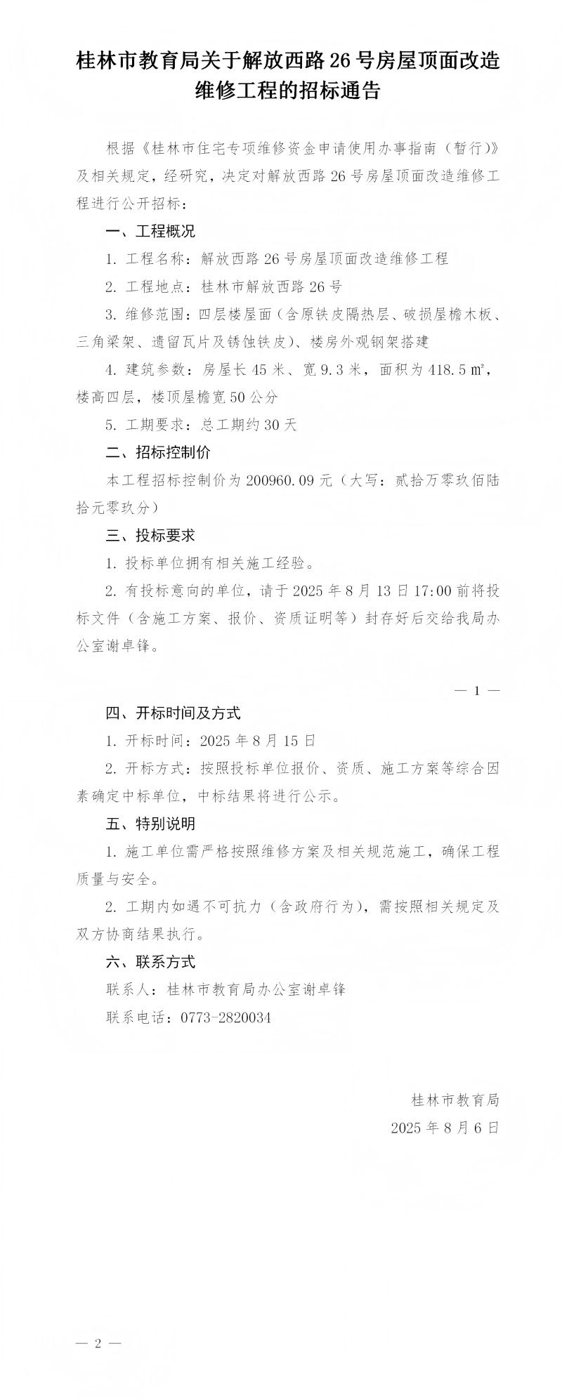 桂林市教育局关于解放西路26号房屋顶面改造维修工程的招标通告