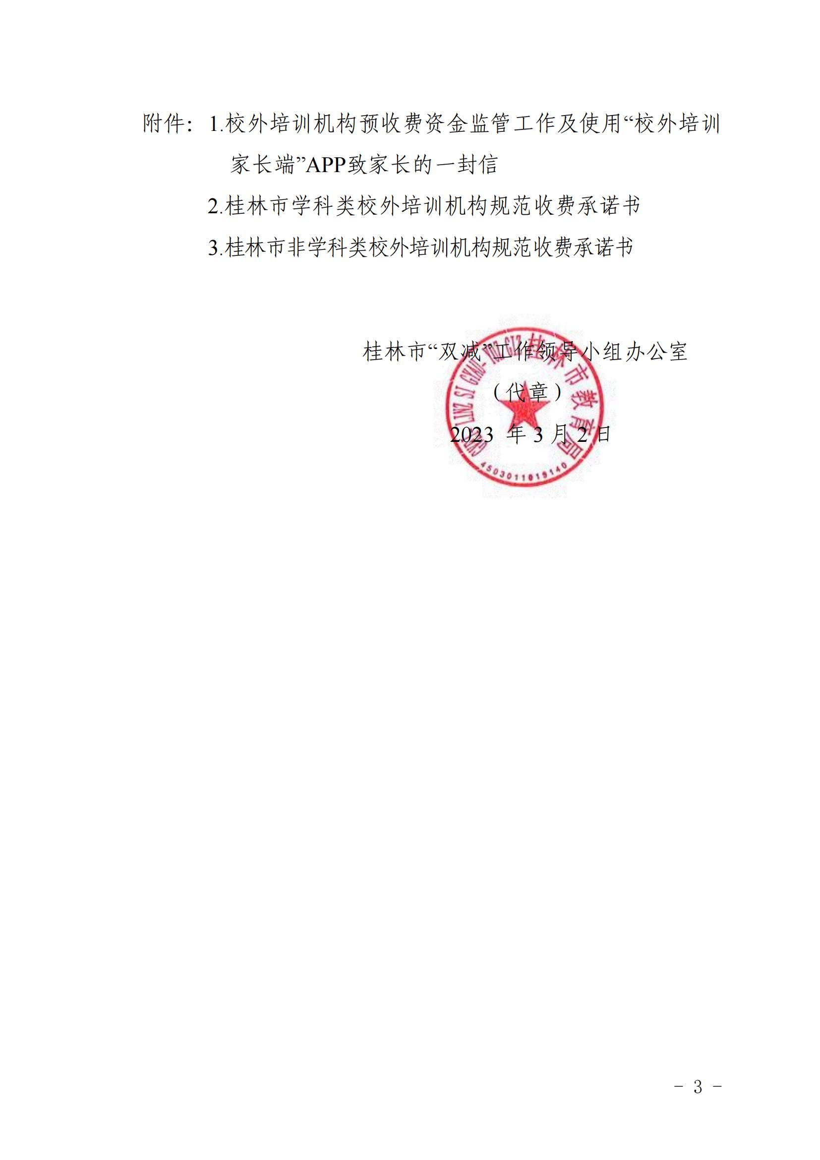 桂林市“双减”工作领导小组办公室关于印发《校外培训机构预收费资金监管工作及使用“校外培训家长端”APP 致家长的一封信》《桂林市校外培训机构规范收费承诺书》的通知