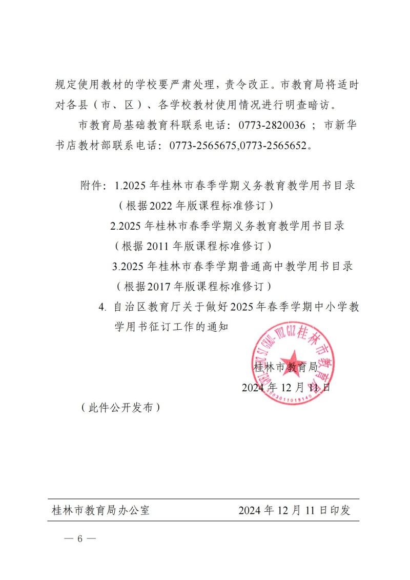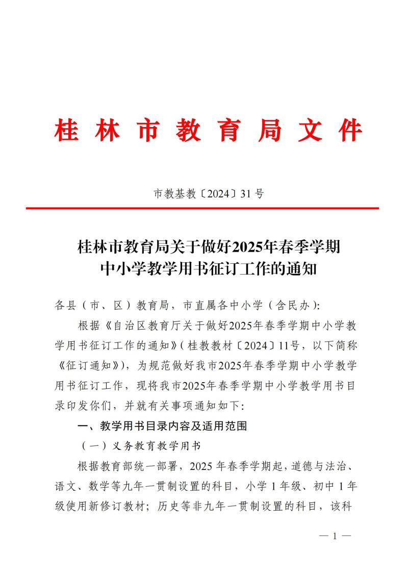 市教基教〔2024〕31号桂林市教育局关于做好2025年春季学期中小学教学用书征订工作的通知