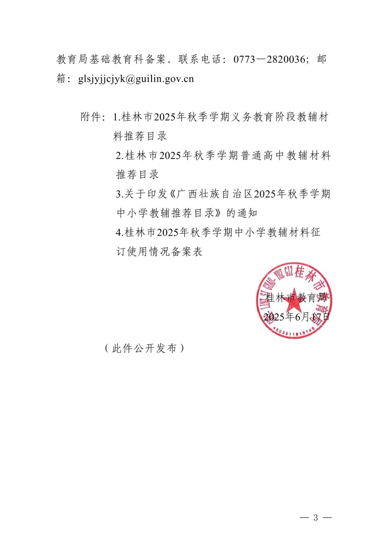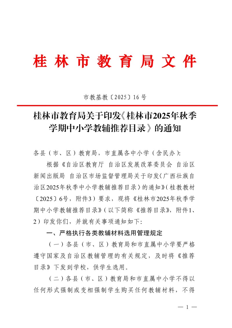 市教基教〔2025〕16 号桂林市教育局关于印发《桂林市2025年秋季学期中小学教辅推荐目录》的通知