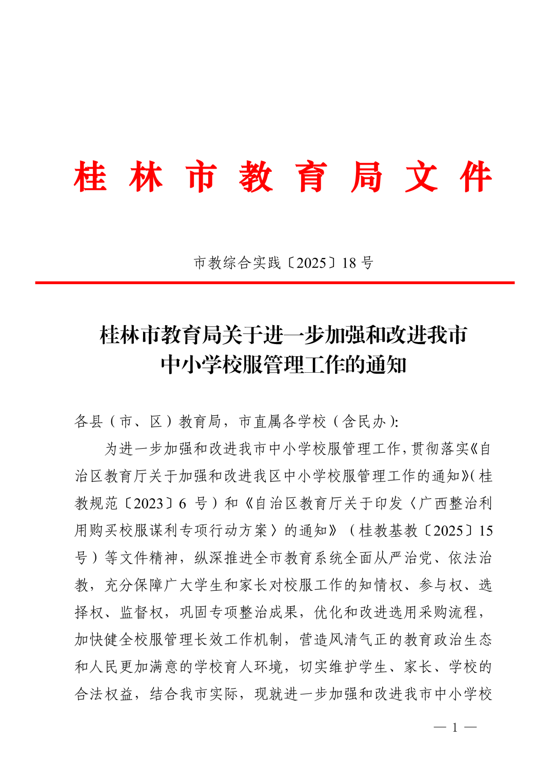 市教综合实践〔2025〕18号桂林市教育局关于进一步加强和改进我市中小学校服管理工作的通知