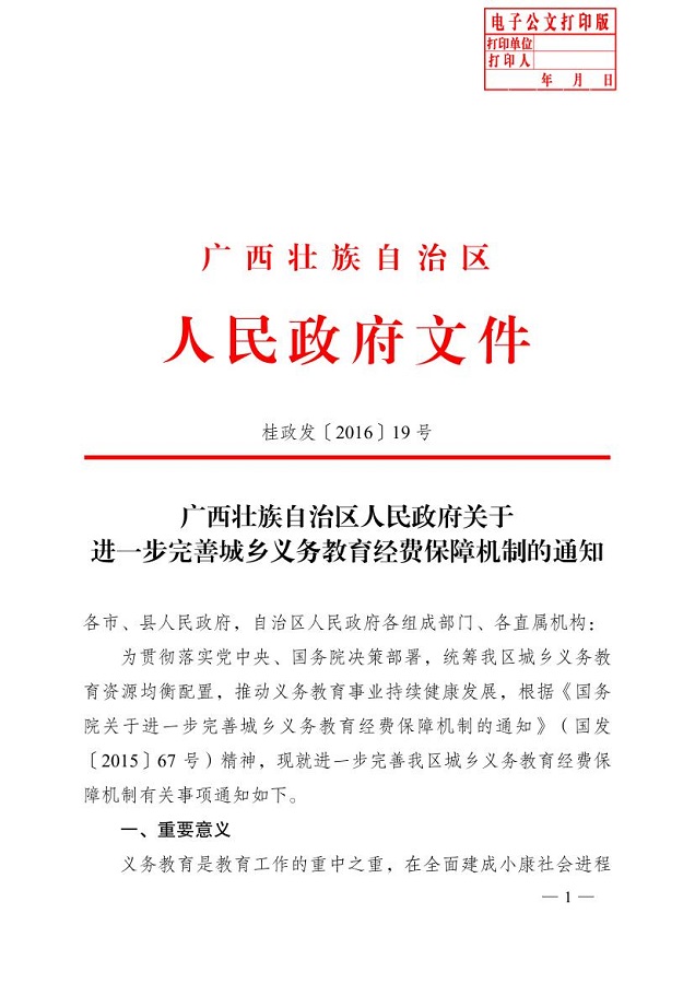 桂政发〔2016〕19号广西壮族自治区人民政府关于进一步完善城乡义务教育经费保障机制的通知