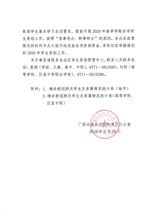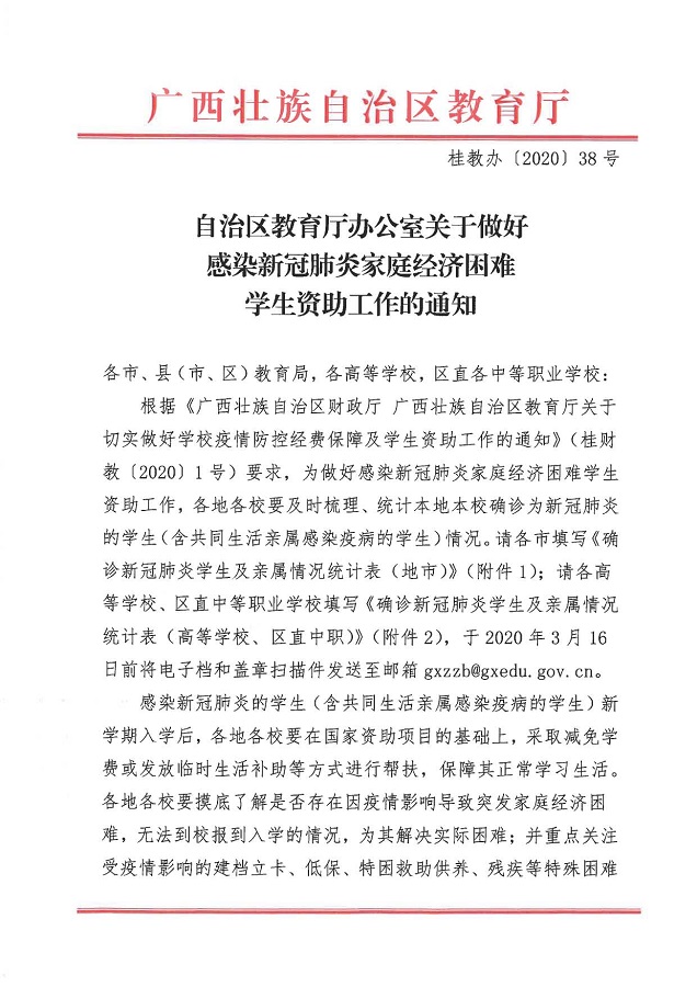 桂教办【2020】38号关于做好感染新冠肺炎家庭经济困难学生资助工作的通知