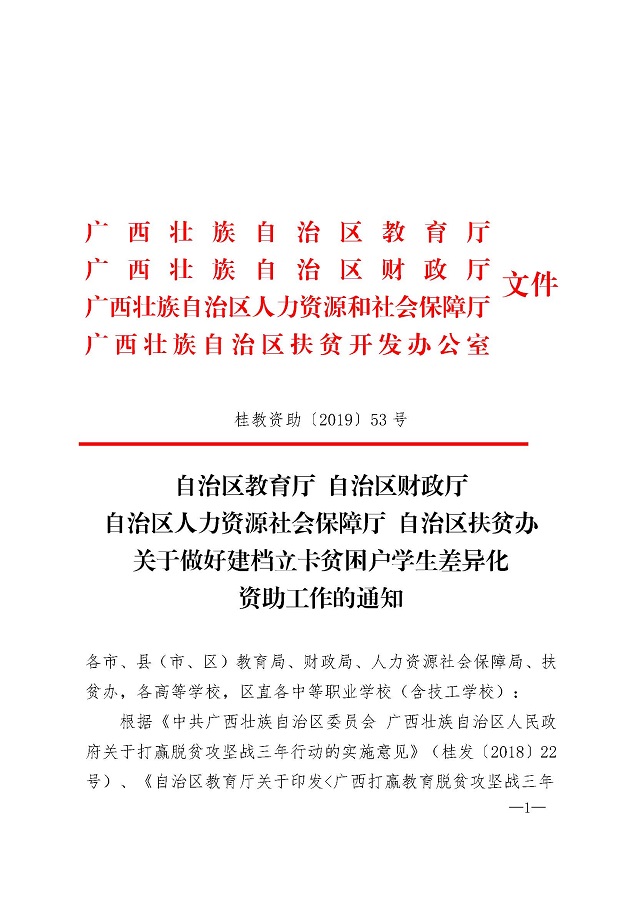 桂教资助〔2019〕53号自治区教育厅 自治区财政厅自治区人力资源社会保障厅 自治区扶贫办关于做好建档立卡贫困户学生差异化资助工作的通知