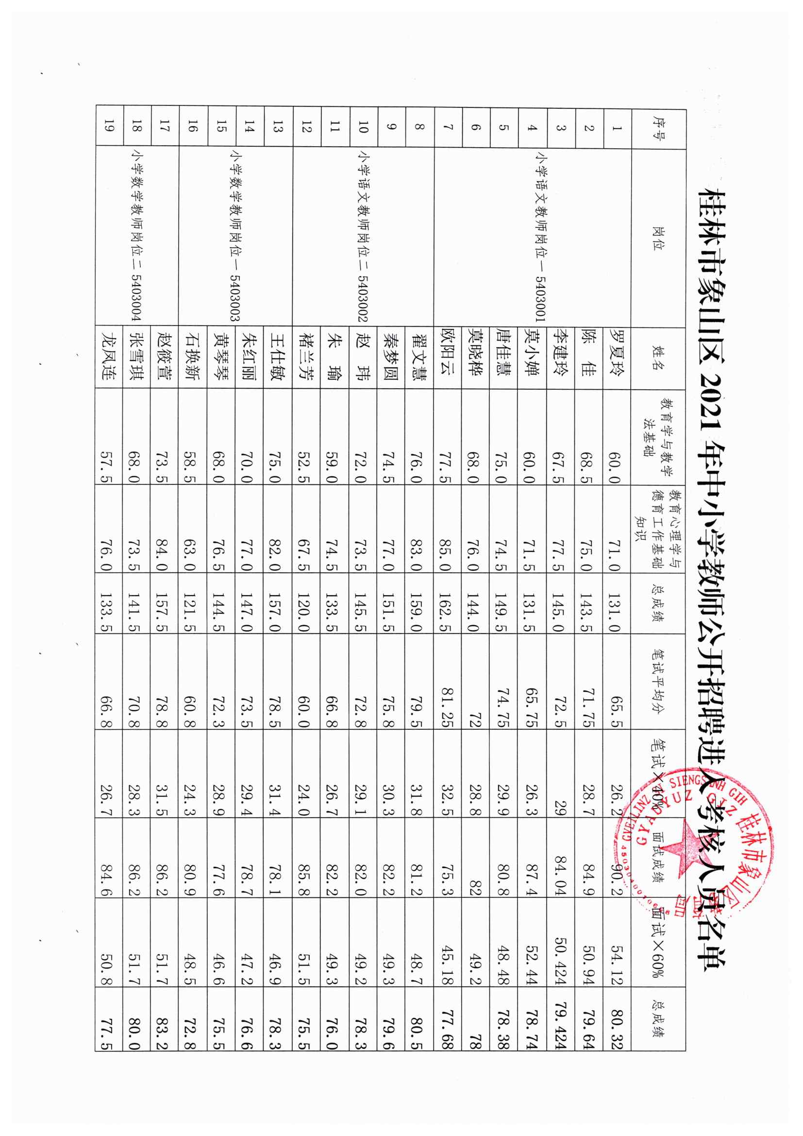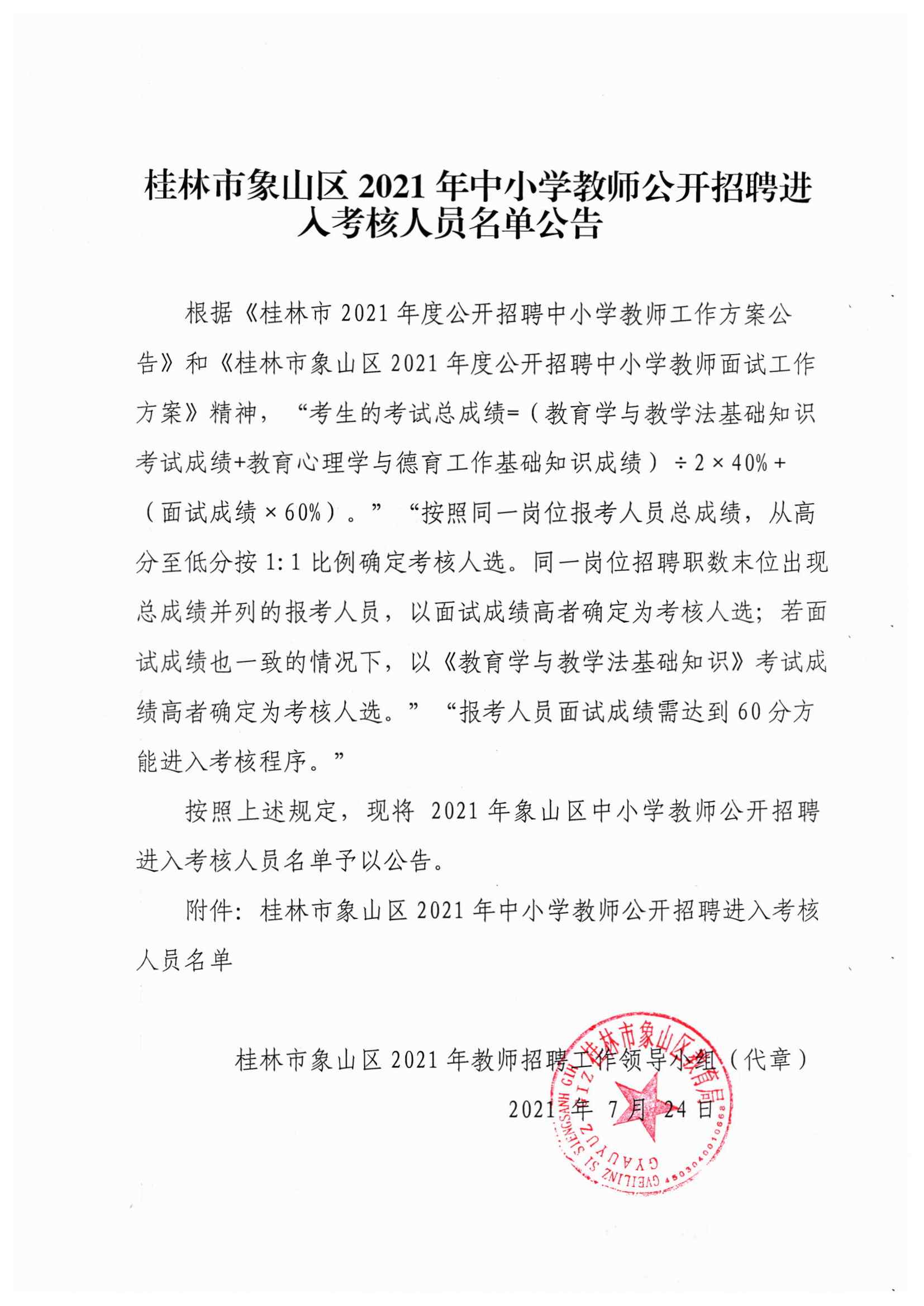 桂林市象山区2021年中小学教师公开招聘进入考核人员名单公告