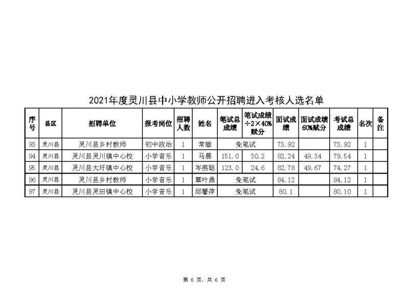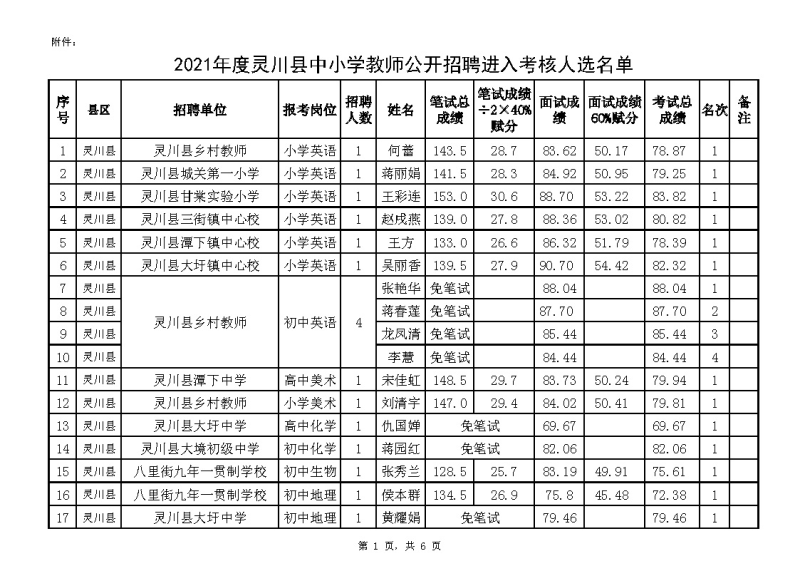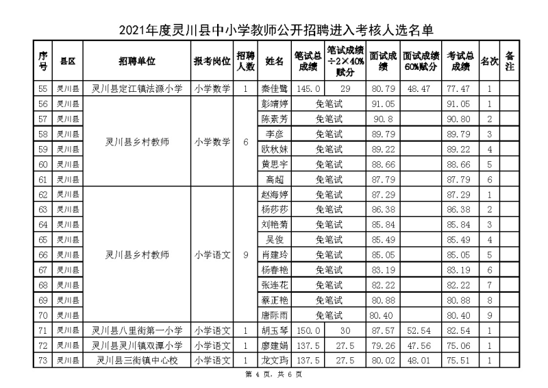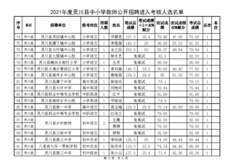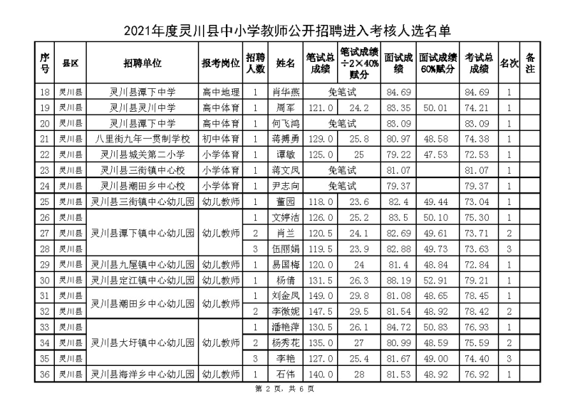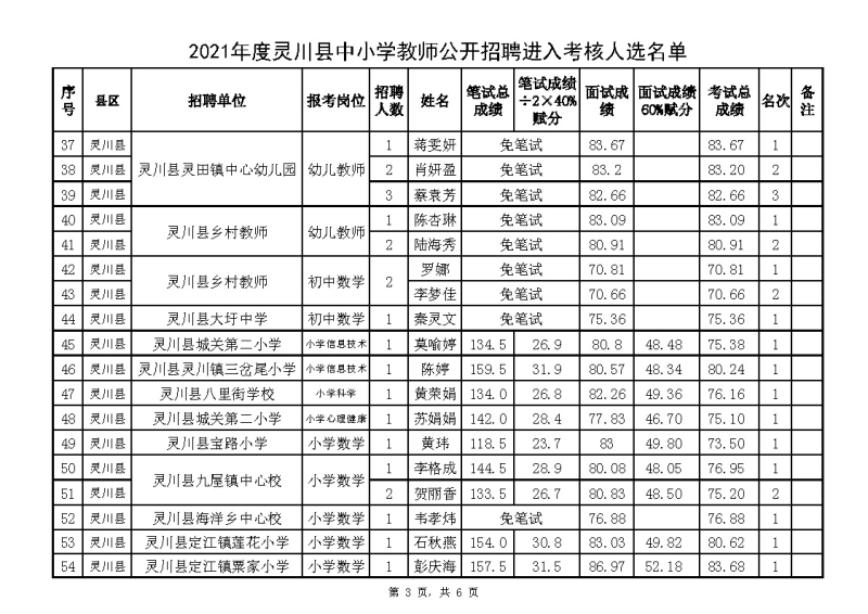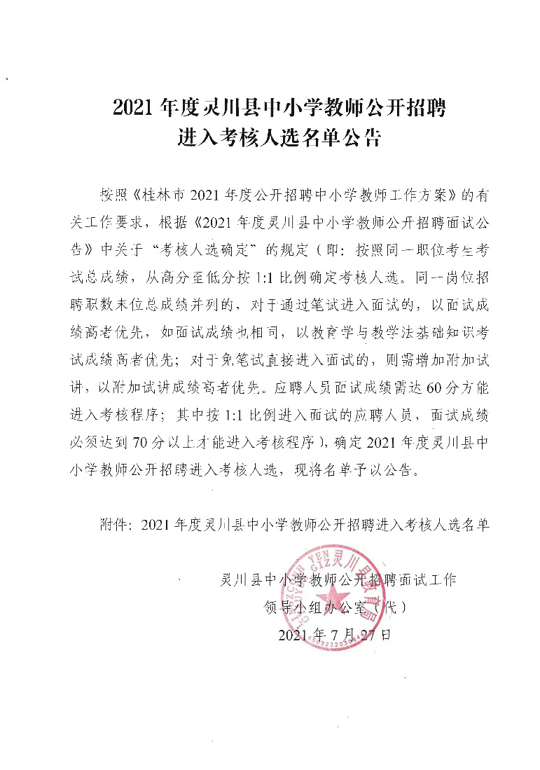 2021年度灵川县中小学教师公开招聘进入考核人选名单公告