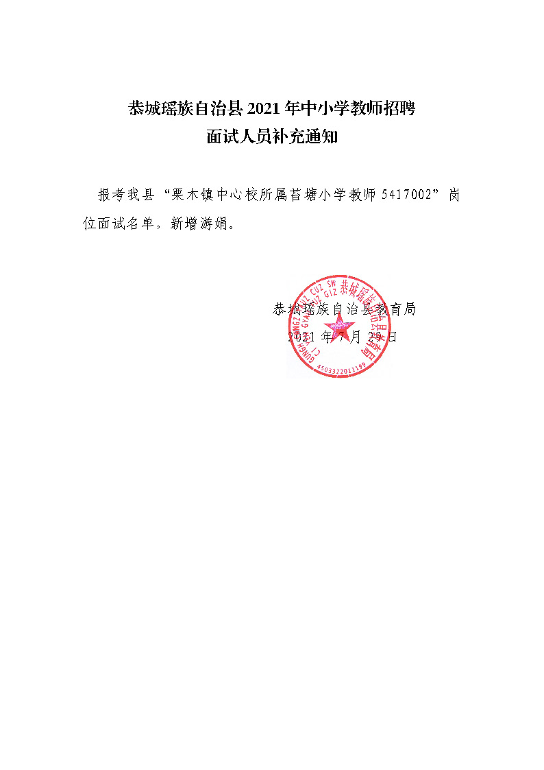 恭城瑶族自治县2021年中小学教师招聘面试人员补充通知