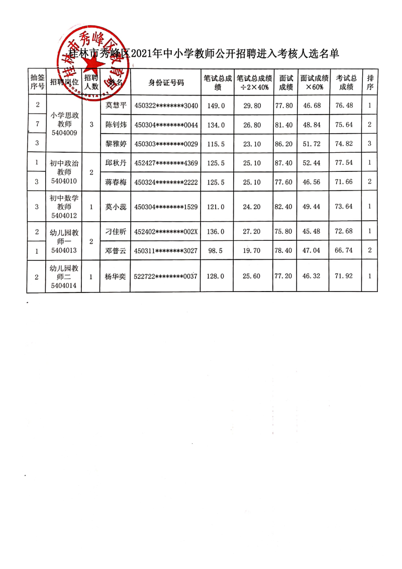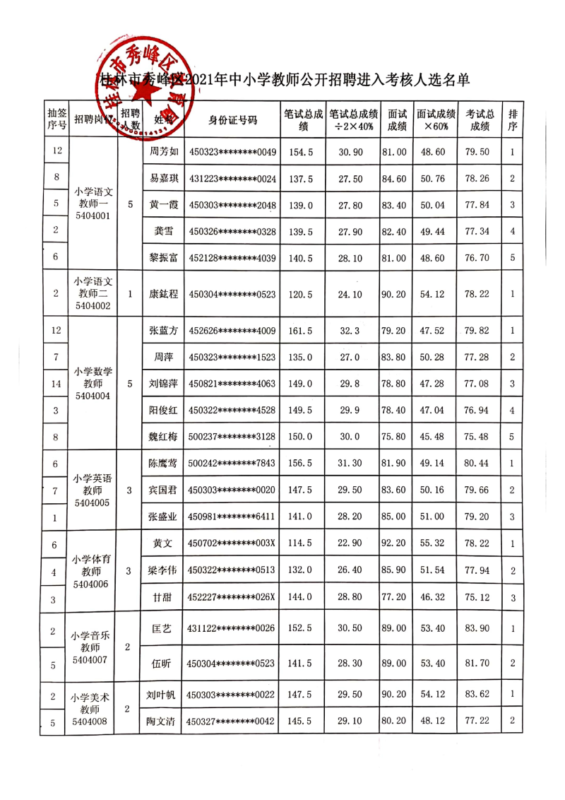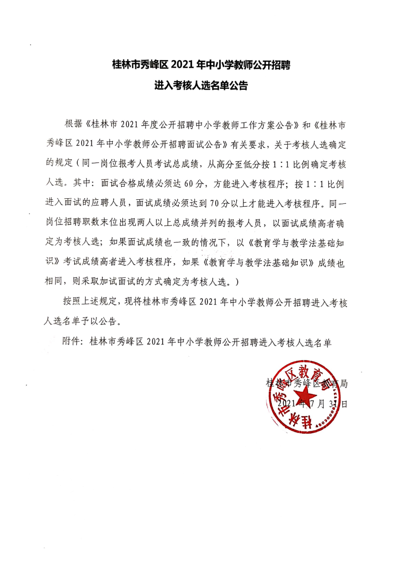 桂林市秀峰区2021年中小学教师公开招聘进入考核人选名单公告