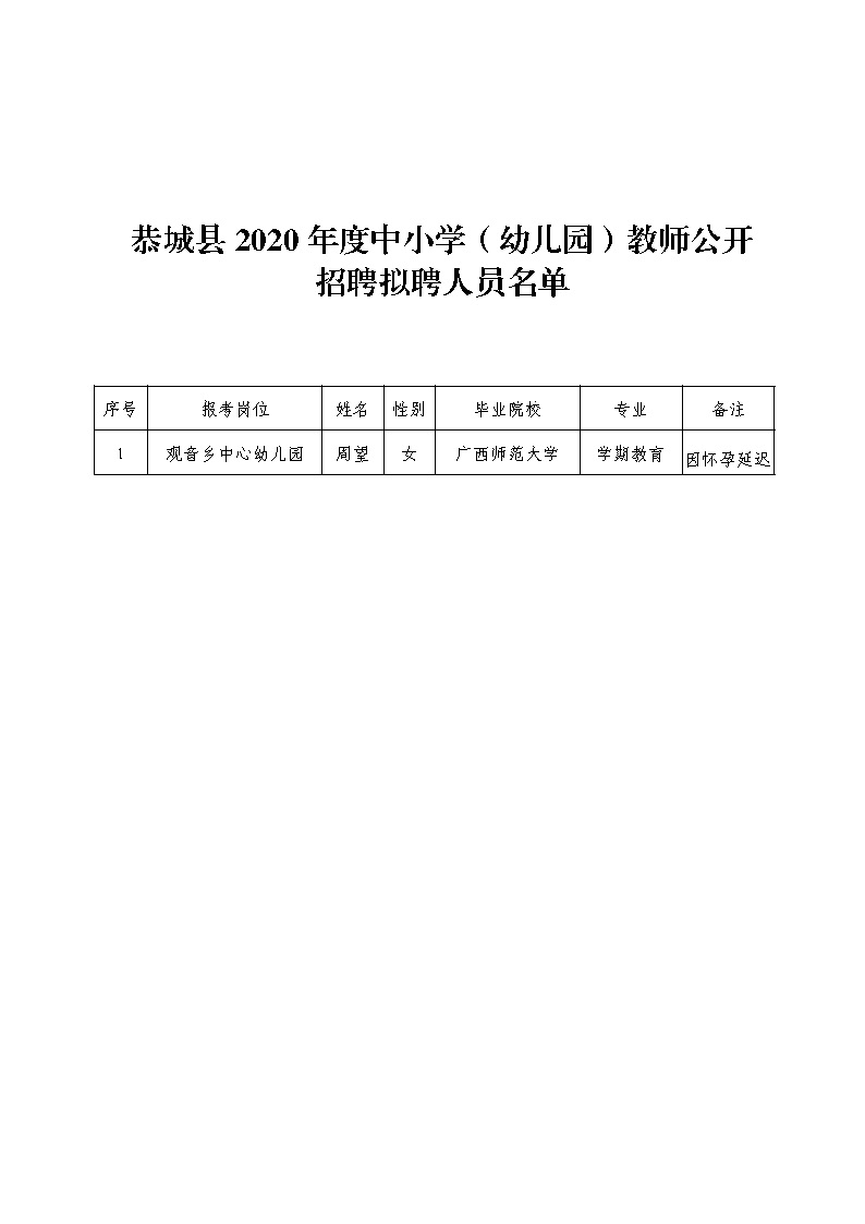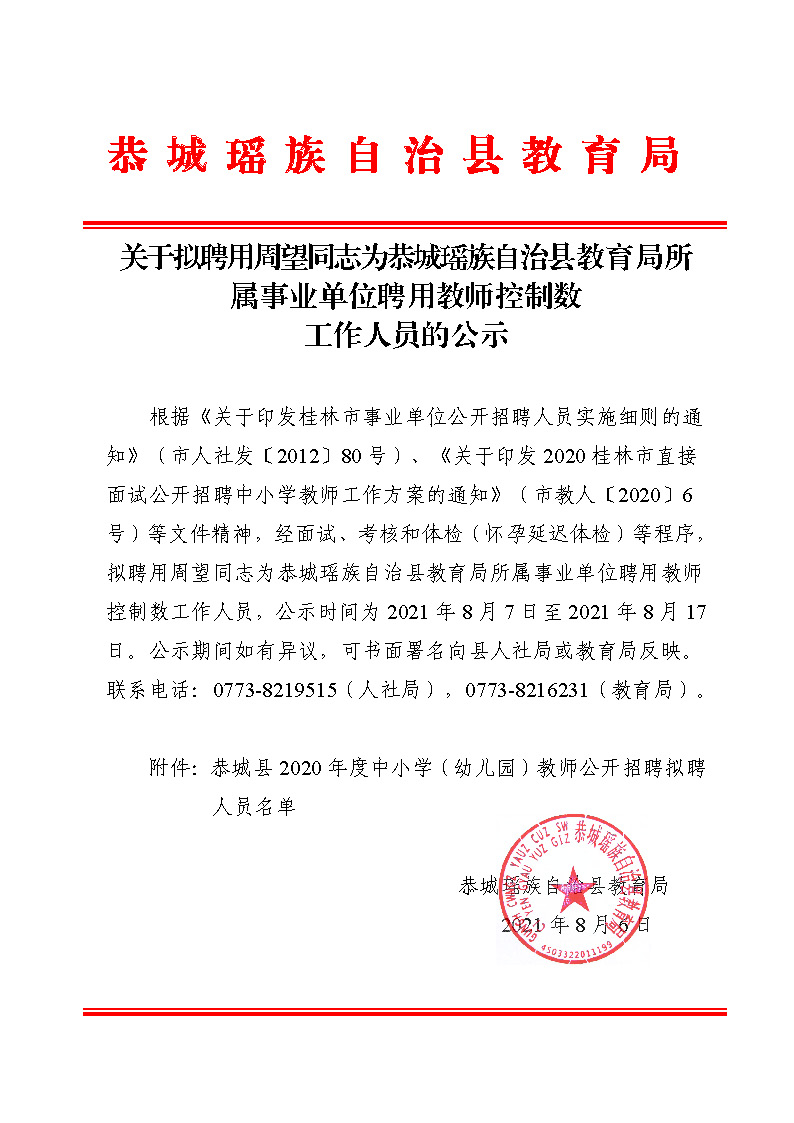 关于拟聘用周望同志为恭城瑶族自治县教育局所属事业单位聘用教师控制数工作人员的公示