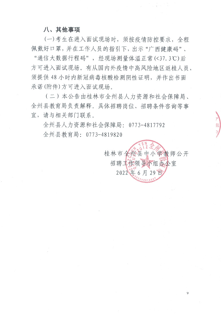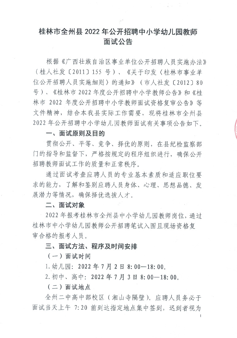 桂林市全州县2022年公开招聘中小学幼儿园教师面试公告