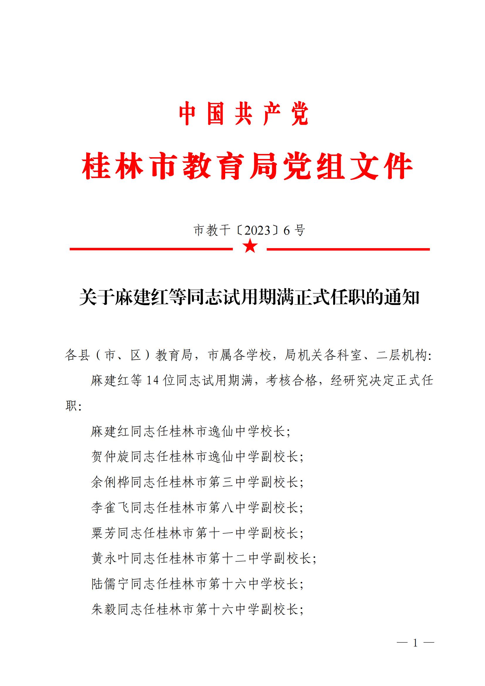 市教干〔2023〕6 号 关于麻建红等同志试用期满正式任职的通知