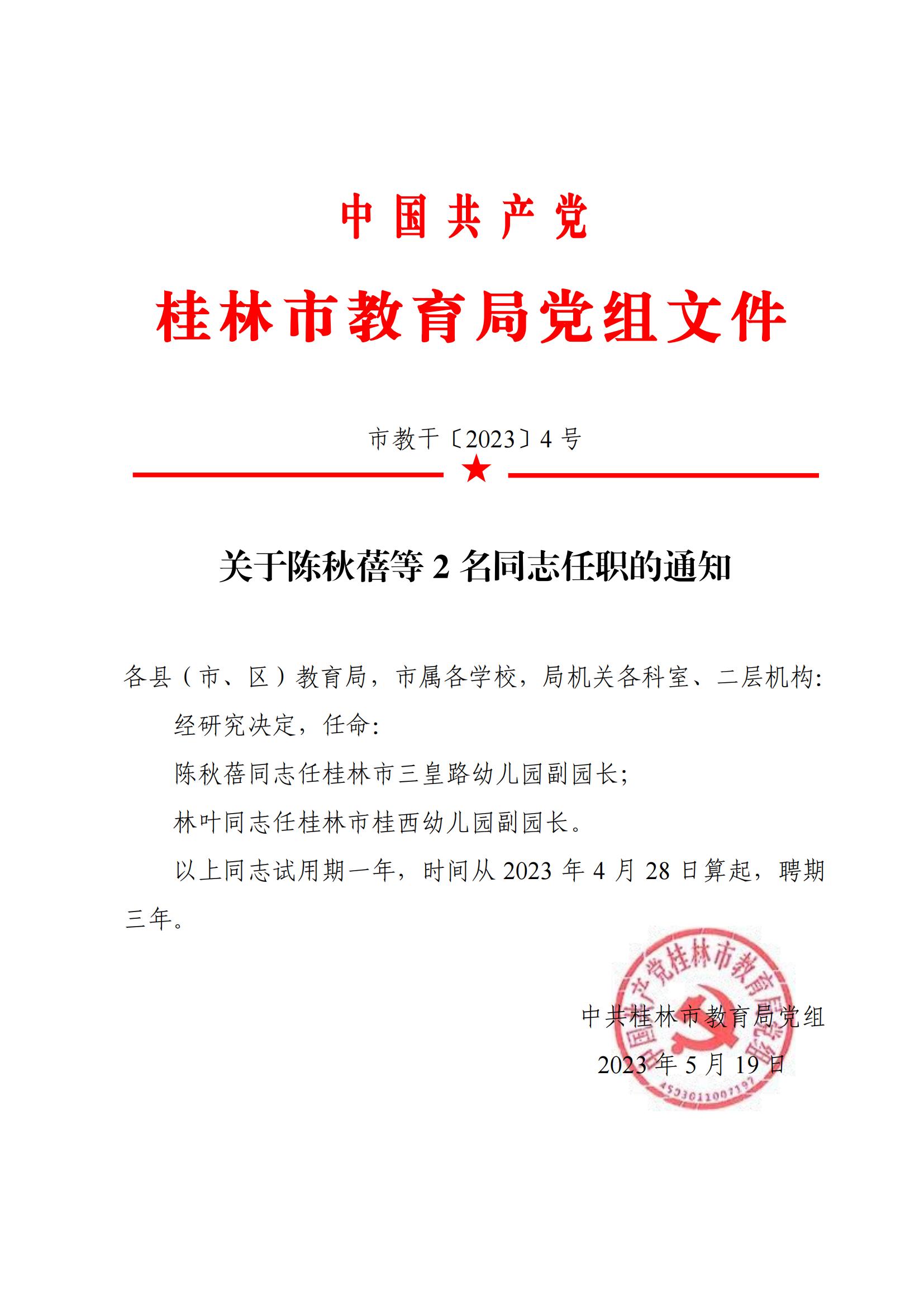 市教干〔2023〕4 号 关于陈秋蓓等 2 名同志任职的通知