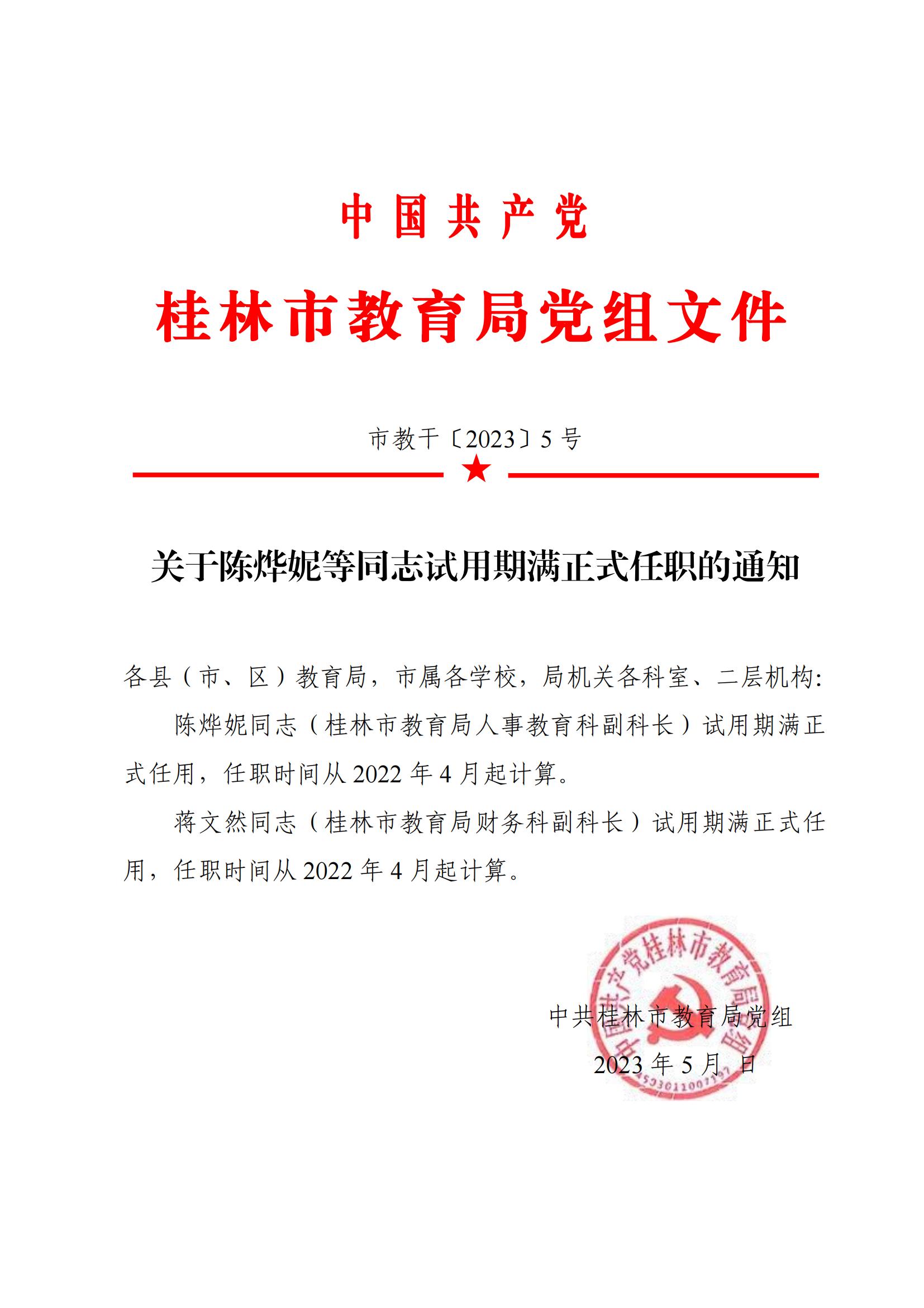 市教干〔2023〕5 号 关于陈烨妮等同志试用期满正式任职的通知