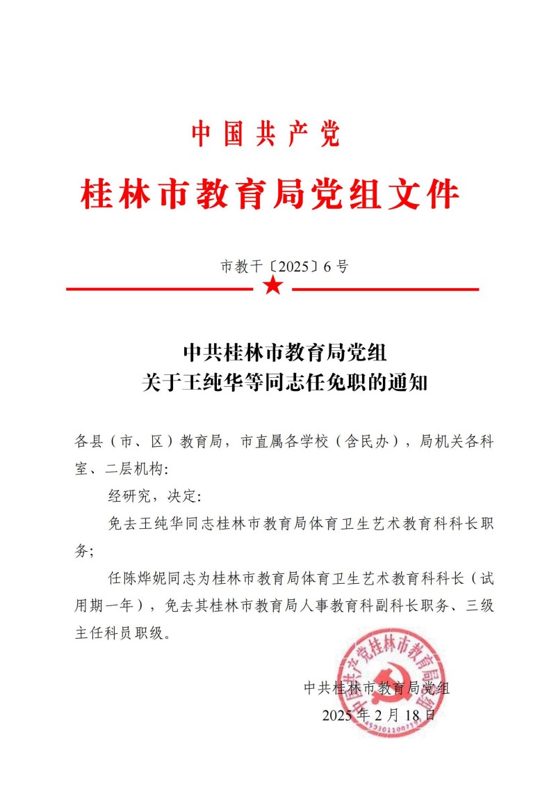 市教干〔2025〕6 号中共桂林市教育局党组关于王纯华等同志任免职的通知