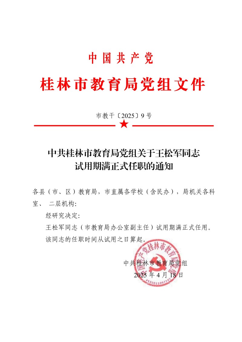 市教干〔2025〕9 号 中共桂林市教育局党组关于王松军同志试用期满正式任职的通知