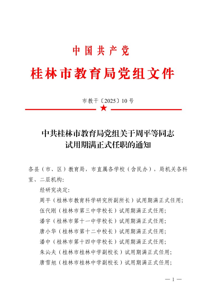 市教干〔2025〕10 号 中共桂林市教育局党组关于周平等同志试用期满正式任职的通知
