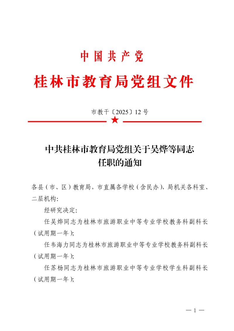 市教干〔2025〕12 号中共桂林市教育局党组关于吴烨等同志任职的通知