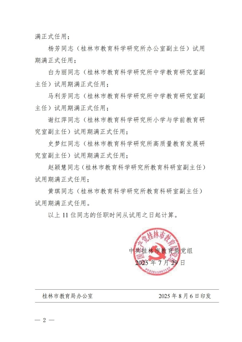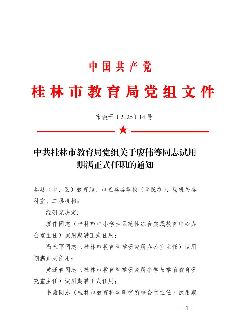 市教干〔2025〕14号中共桂林市教育局党组关于廖伟等同志试用期满正式任职的通知