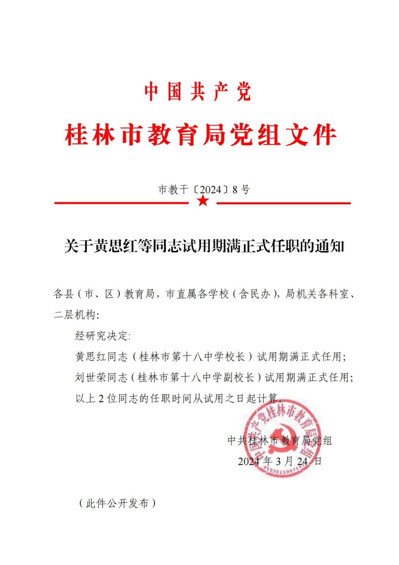 市教干〔2024〕8号 关于黄思红等同志试用期满正式任职的通知