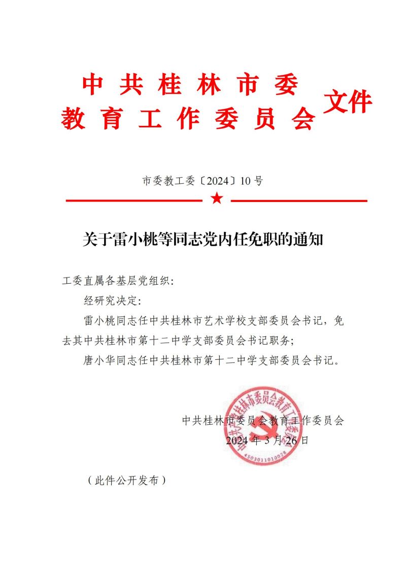 市委教工委〔2024〕10号 关于雷小桃等同志党内任免职的通知