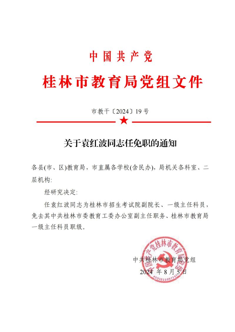 市教干〔2024〕19 号关于袁红波同志任免职的通知