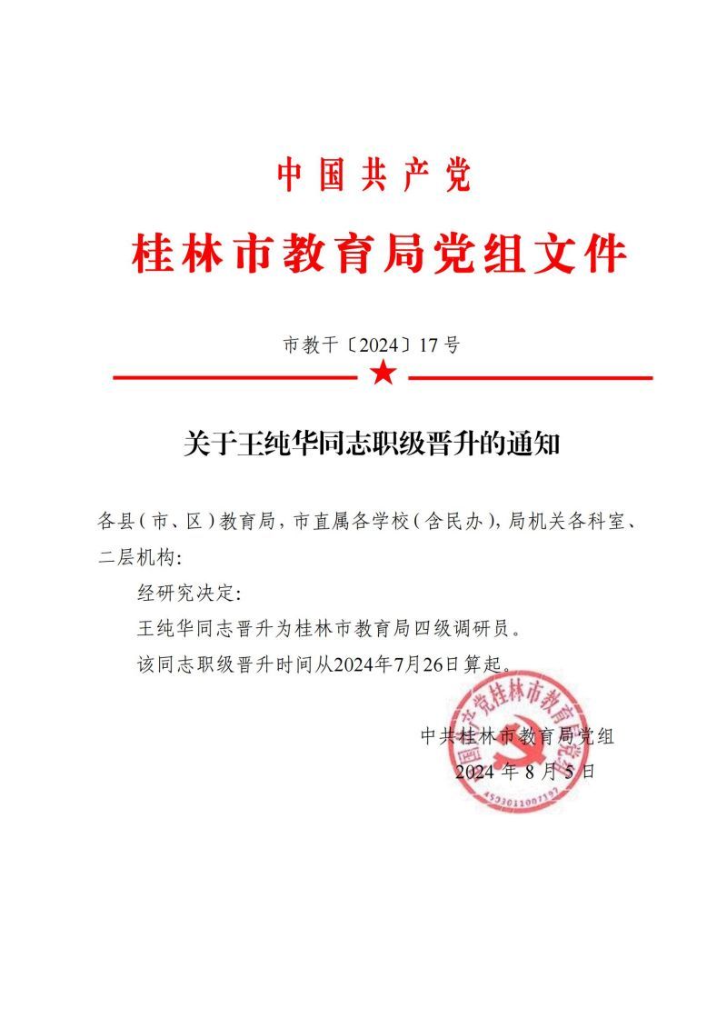 市教干〔2024〕17 号关于王纯华同志职级晋升的通知
