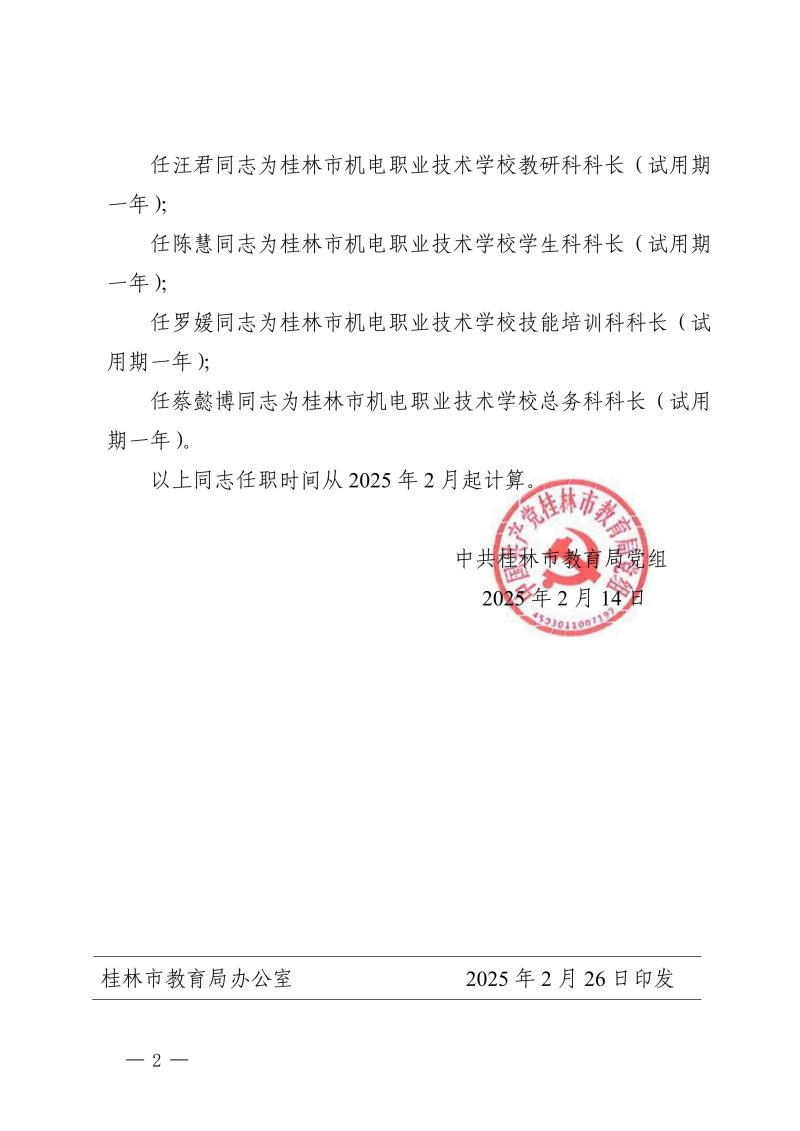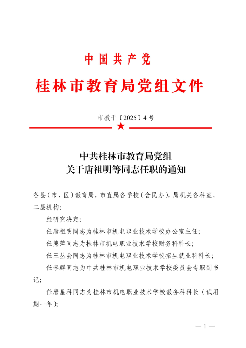 市教干〔2025〕4 号 中共桂林市教育局党组关于唐祖明等同志任职的通知