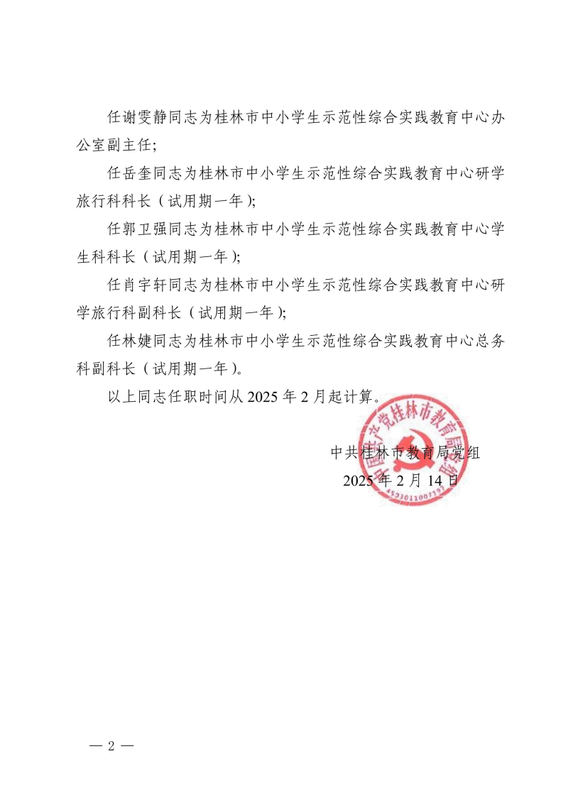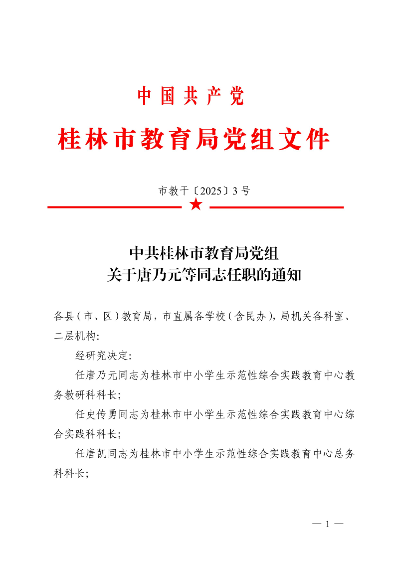 市教干〔2025〕3 号 中共桂林市教育局党组关于唐乃元等同志任职的通知