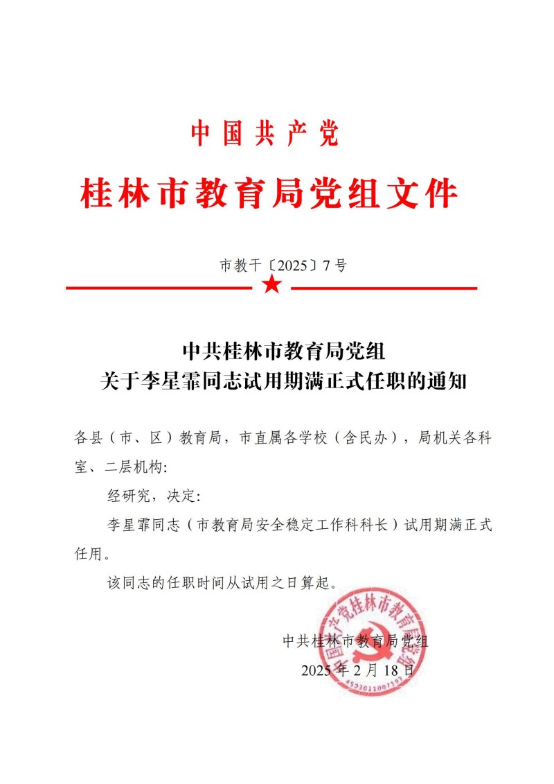 市教干〔2025〕7 号中共桂林市教育局党组关于李星霏同志试用期满正式任职的通知