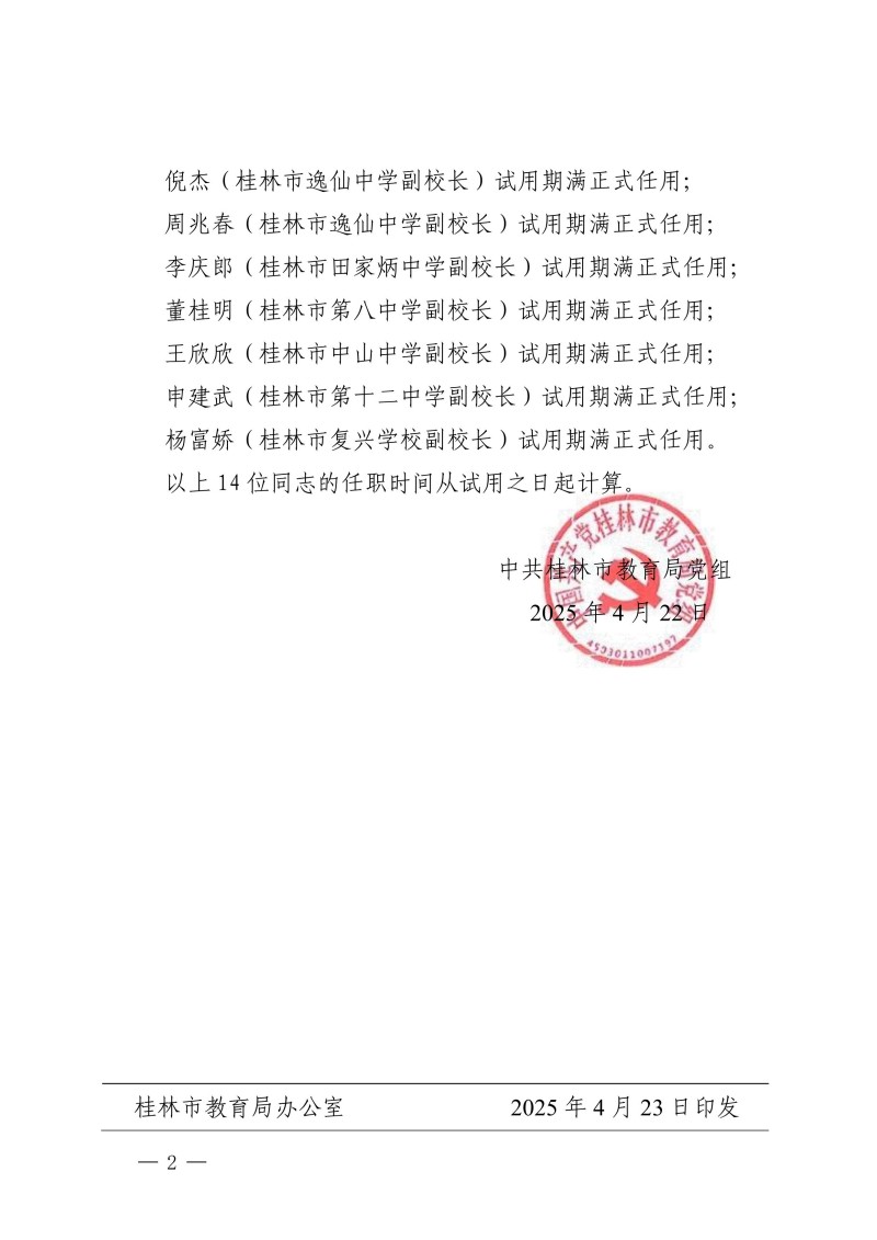 市教干〔2025〕10 号 中共桂林市教育局党组关于周平等同志试用期满正式任职的通知