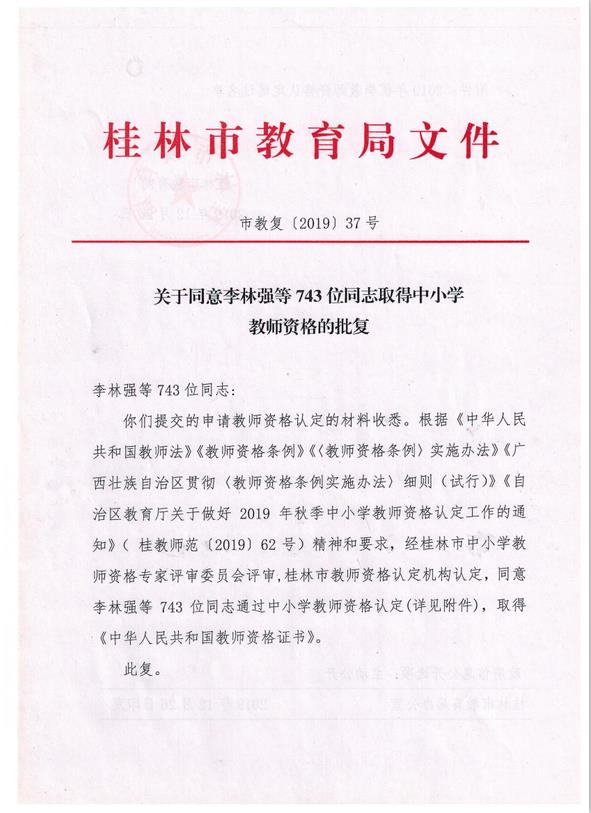 关于同意李林强等743位同志取得中小学教师资格的批复(市教复〔2019〕37号)