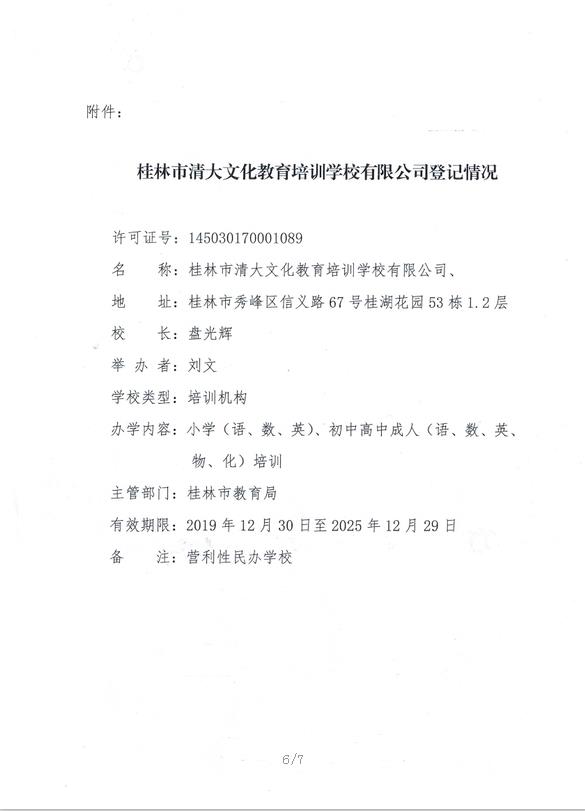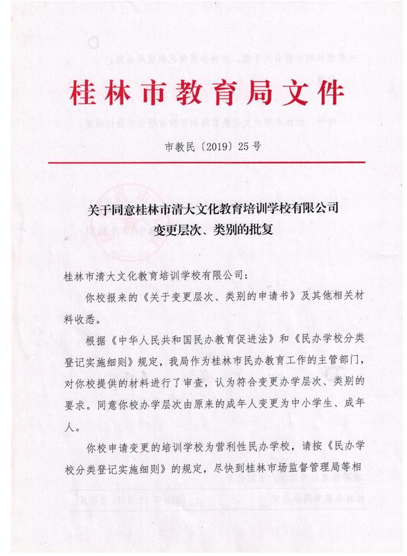 关于同意桂林市清大文化教育培训学校有限公司变更层次、类别的批复(市教民〔2019〕25号)