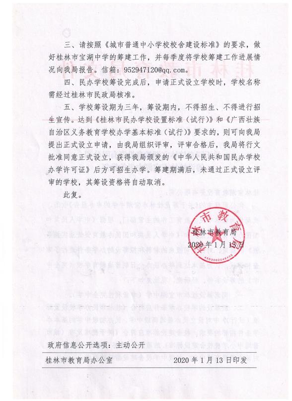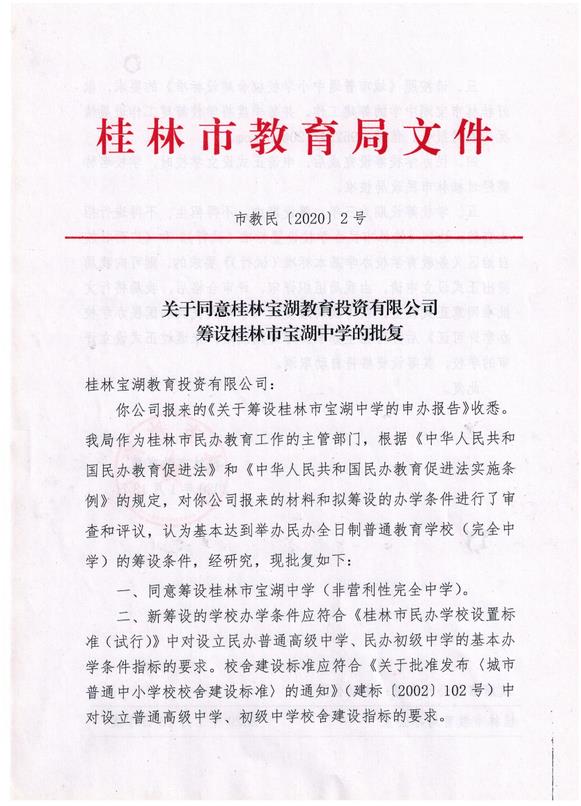 关于同意桂林宝湖教育投资有限公司筹设桂林市宝湖中学的批复(市教民〔2020〕2号)