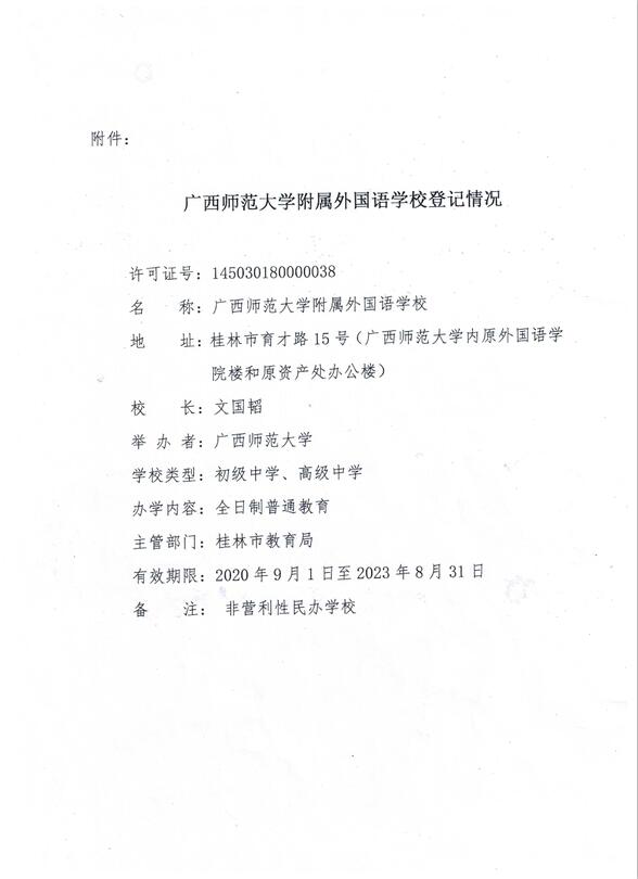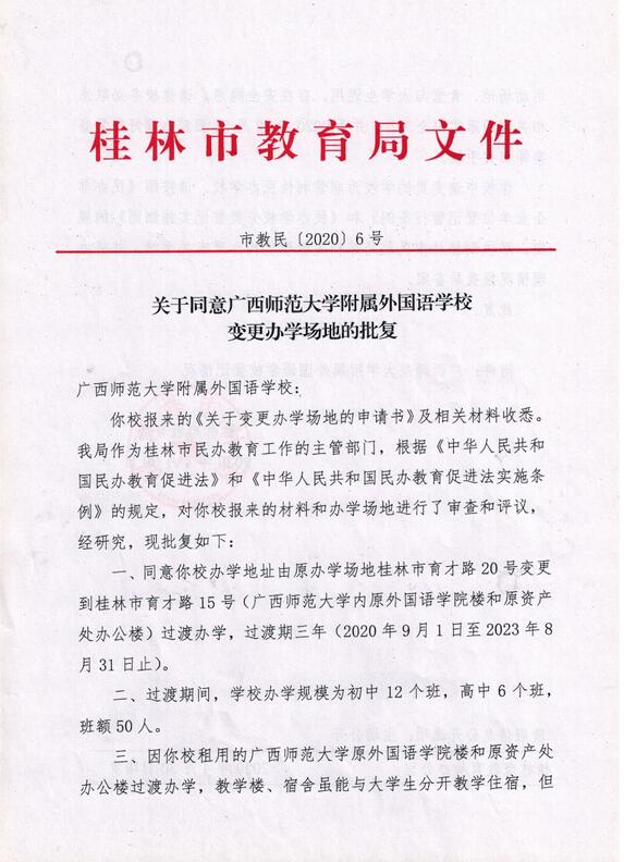 关于同意广西师范大学附属外国语学校变更办学场地的批复(市教民〔2020〕6号)