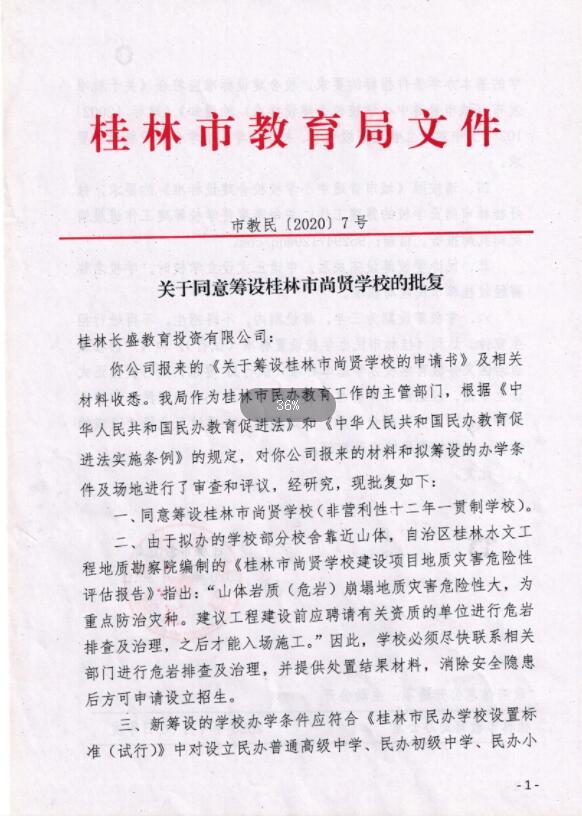 关于同意桂林长盛教育投资有限公司筹设桂林市尚贤学校的批复》(市教民〔2020〕7号)