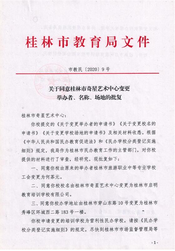 关于同意桂林市奇星艺术中心变更举办者变更名称变更场地的批复(市教民〔2020〕9号)