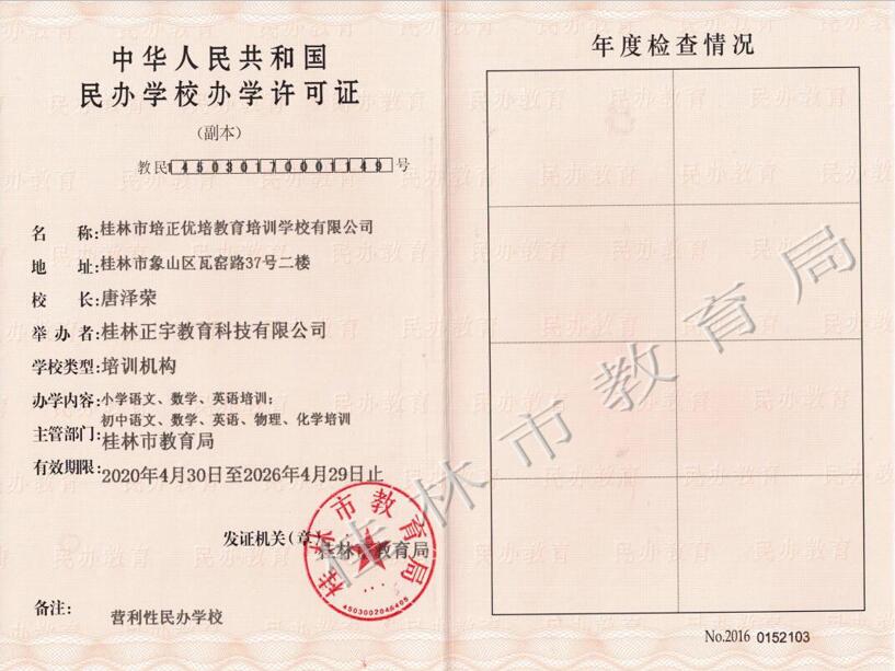 桂林市培正优培教育培训学校有限公司办学许可证(正副本)